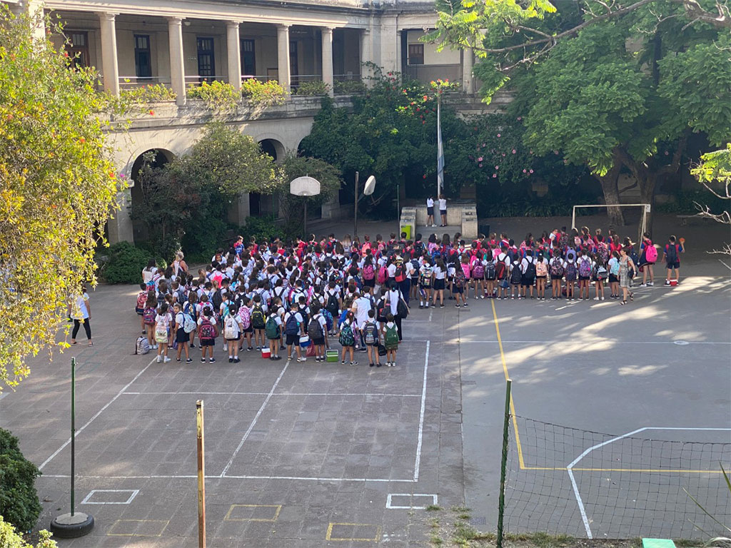 Conjunto pantalón largo, chomba y campera reglamentarios; pantalón corto en época de calor o pollera pantalón; buzo azul liso; campera de abrigo azul lisa; mochila reglamentaria (azul); zapatillas blancas o negras.